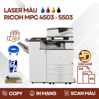 Máy Photocopy Ricoh MP C4503 máy photocopy chuyên nghiệp hội đủ mọi chức năng cần thiết bao gồm photo màu, in màu mạng, scan màu và fax. Người sử dụng không cần tốn thêm chi phí để trang bị bất kỳ thiết bị văn phòng nào nữa.